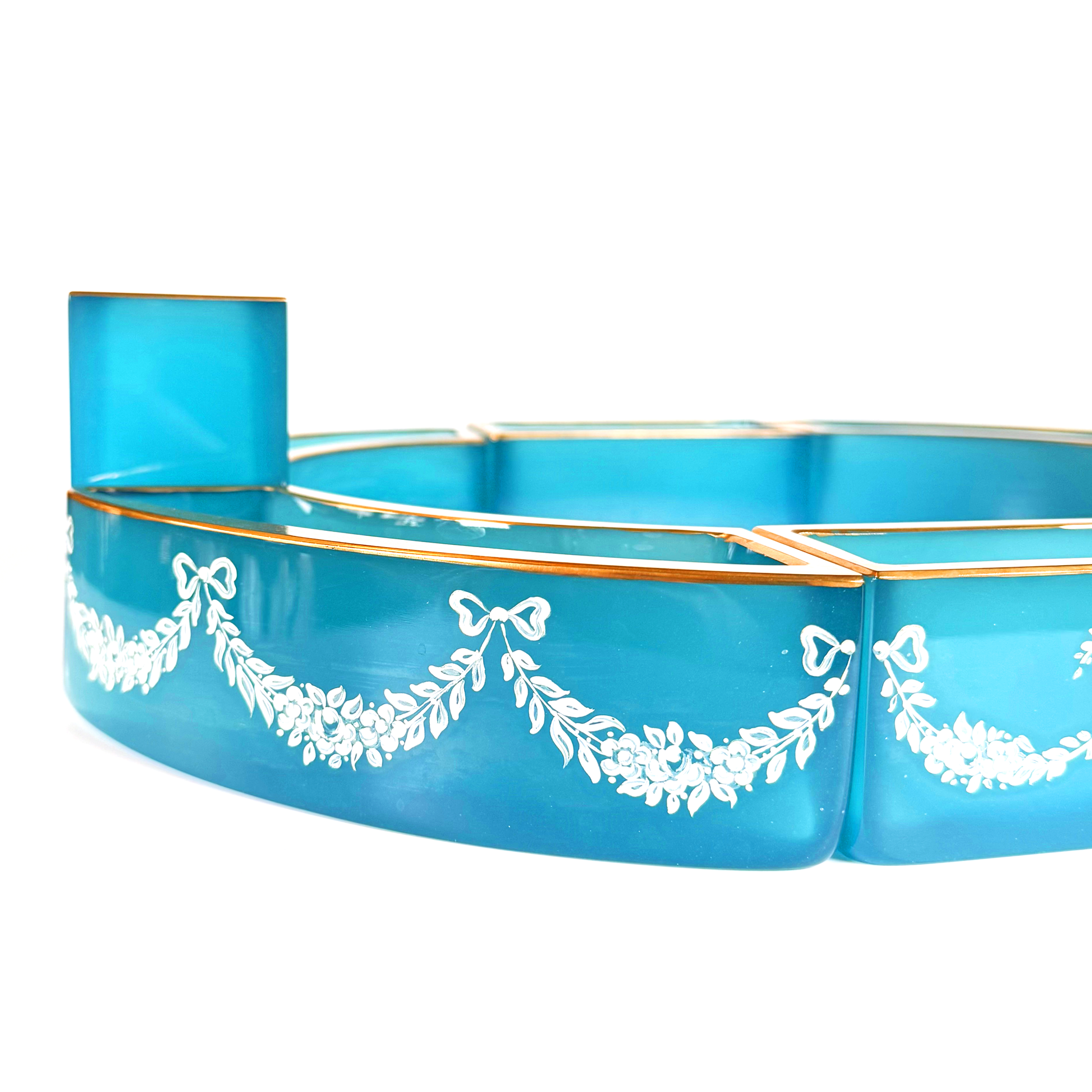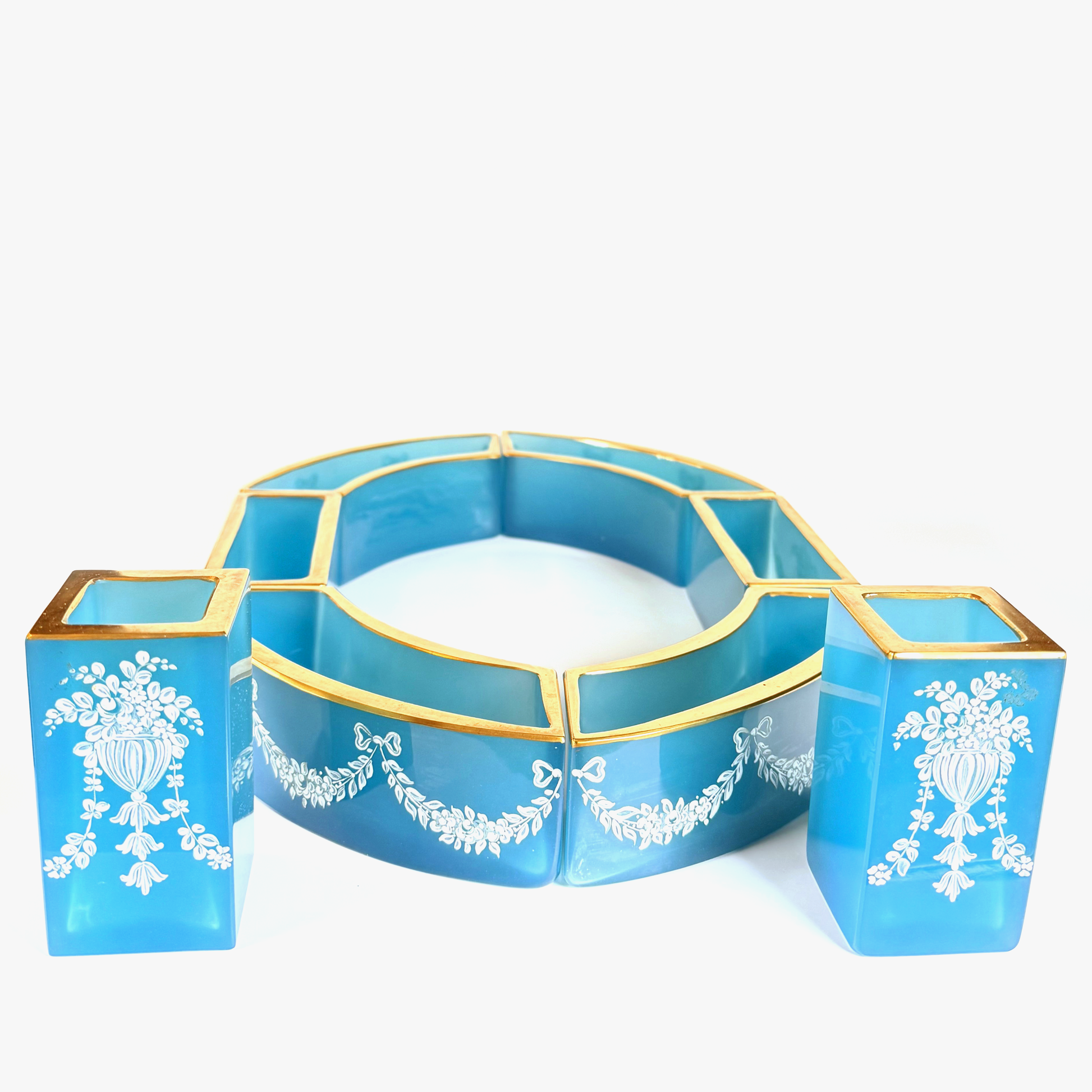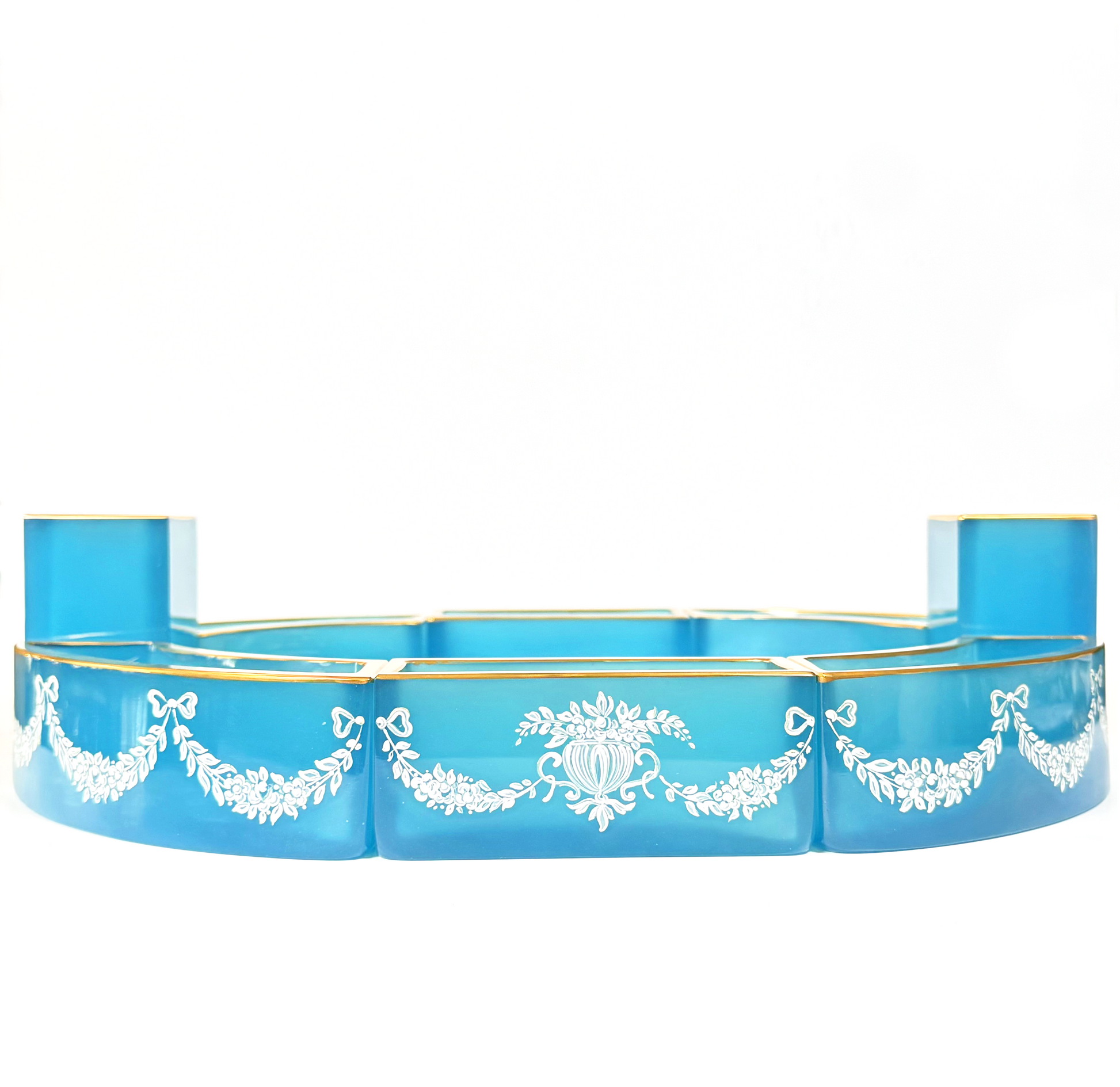 This exceptional 19th-century French opaline glass centerpiece set is one of those I know I’ll never encounter again. Eight individual opaline pieces join together to form an oval centerpiece, each one beautifully accented with gilt detailing and delicate white enamel florals with bow-swag motifs.